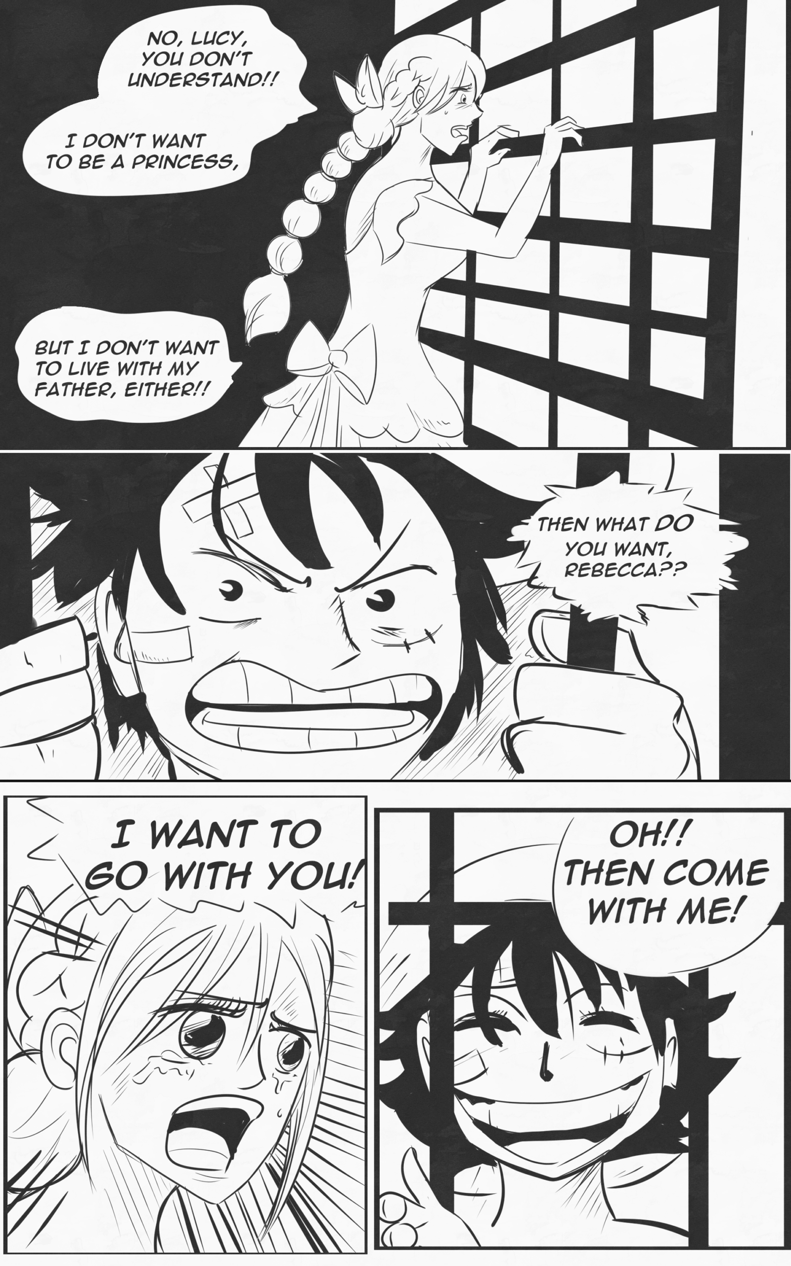 A comic page illustrating the divergent moment between canon chapter 797 and Deicide AU for Rebecca, when she goes with the Straw Hats instead of staying with her father.